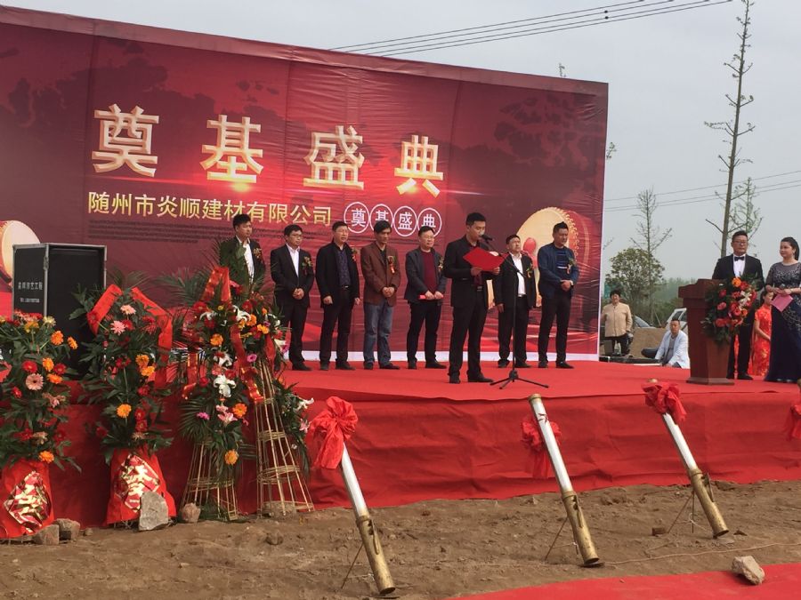 4月14日上午,隨州市炎順建材有限公司項(xiàng)目奠基儀式于隨縣新經(jīng)濟(jì)開發(fā)區(qū)新項(xiàng)目建設(shè)基地隆重舉行,炎順瓦業(yè)公司董事長(zhǎng)劉永德,總經(jīng)理劉炎、衡陽炎順瓦業(yè)公司總經(jīng)理劉永才、總監(jiān)陳月棟,泉州炎順瓦業(yè)公司總經(jīng)理劉歡、總監(jiān)劉東方以及公司運(yùn)營(yíng)部、財(cái)務(wù)部、研發(fā)部、廠區(qū)、質(zhì)保部等相關(guān)負(fù)責(zé)人攜全體員工共同參加了本次儀式,同時(shí)蒞臨奠基儀式的嘉賓有隨縣政府的副縣長(zhǎng),江蘇波美特瓦業(yè)有限公司宋總攜夫人等考察團(tuán)一行。 據(jù)相關(guān)資料顯示,炎順集團(tuán)隨州基地概況:占地面積:40畝、投資金額:1億5000萬、工廠面積:1萬平方米、辦公樓面積:2800平方、住宅樓面積:2800平方、就業(yè)人員:200人、年產(chǎn)值:1.2億元人民幣。